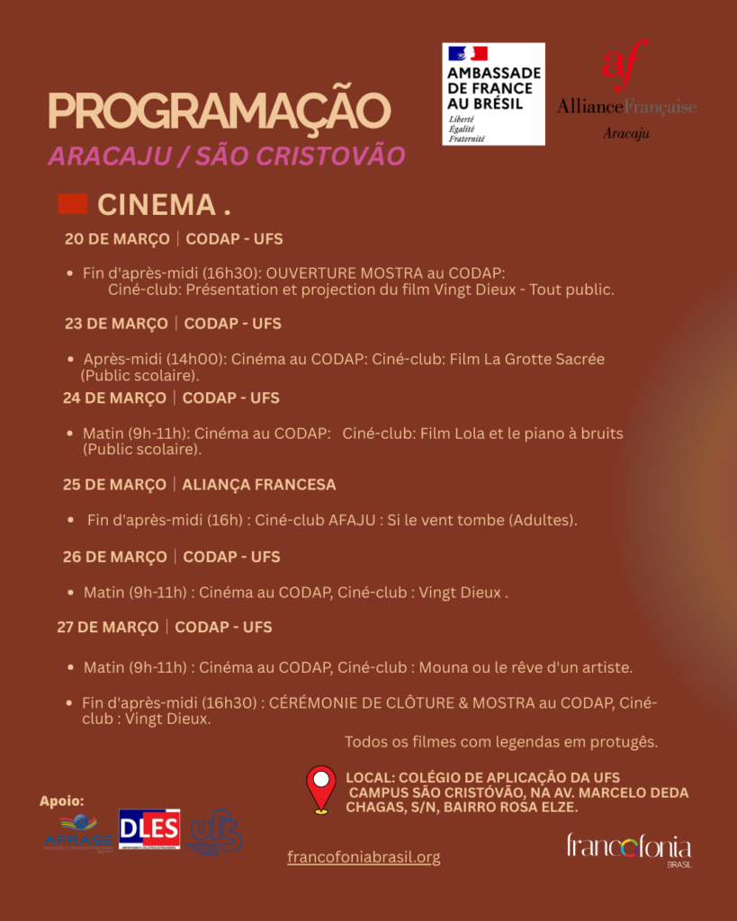 A programação também destaca a obra Mouna ou o Sonho de um Artista, reforçando a produção artística do mundo francófono. O encerramento festivo será na sexta-feira (27/03), com a última exibição de Vinte Deuses às 16h30. O evento é fruto de uma parceria de sucesso entre o Consulado da França, a Aliança Francesa e o Professor Ricardo Costa dos Santos, CODAP da UFS.